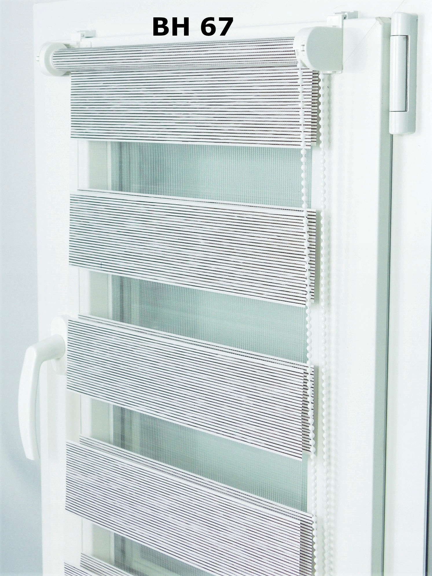 Tkanina składa się z naprzemiennie utkanej tkaniny (75mm) i siatki przeźroczystej (50mm), co pozwala nam na dowolną regulację pomieszczenia. Roletą można pomieszczenie całkowicie przysłonić, częściowo lub można ją całkowicie zwinąć.