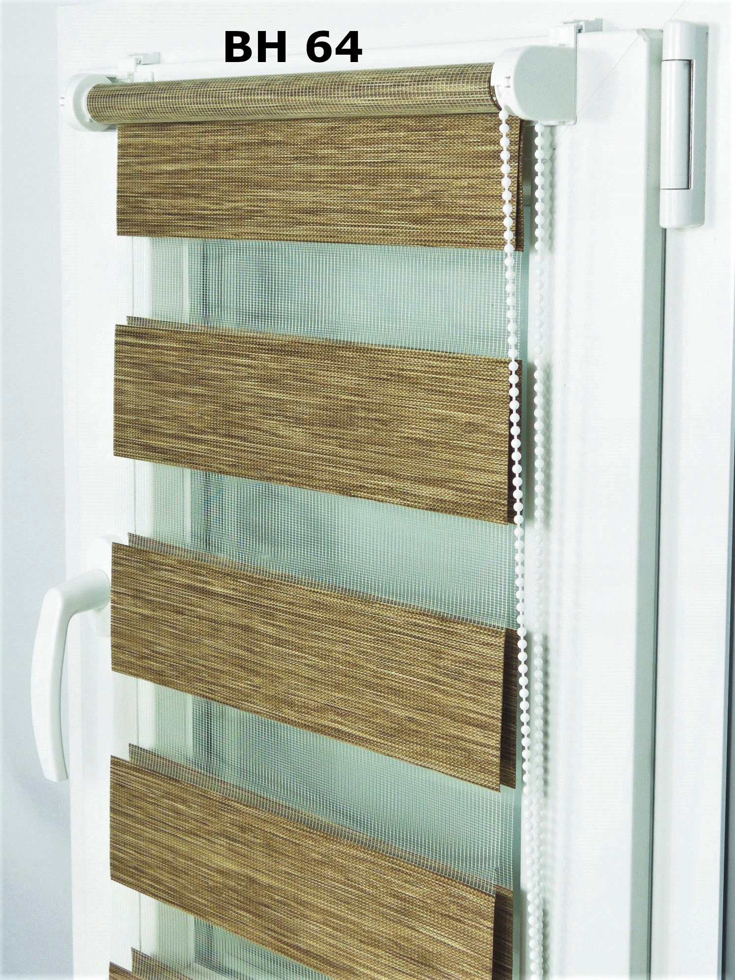 Tkanina składa się z naprzemiennie utkanej tkaniny (75mm) i siatki przeźroczystej (50mm), co pozwala nam na dowolną regulację pomieszczenia. Roletą można pomieszczenie całkowicie przysłonić, częściowo lub można ją całkowicie zwinąć.