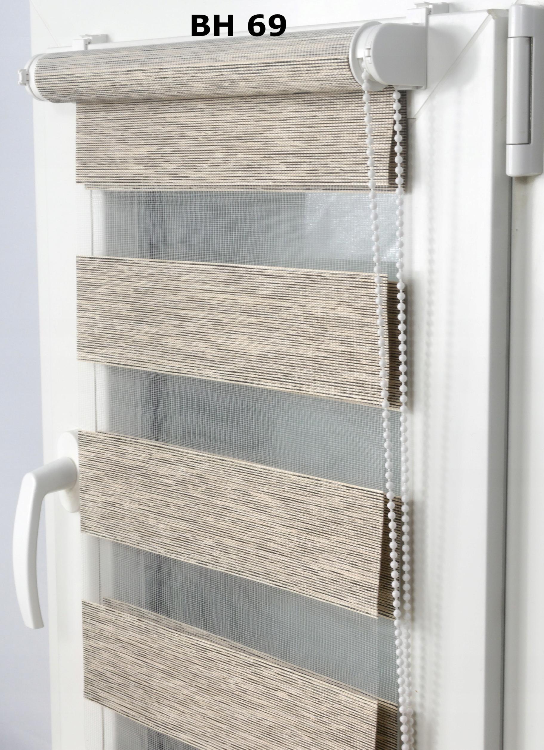 Tkanina składa się z naprzemiennie utkanej tkaniny (75mm) i siatki przeźroczystej (50mm), co pozwala nam na dowolną regulację pomieszczenia. Roletą można pomieszczenie całkowicie przysłonić, częściowo lub można ją całkowicie zwinąć.